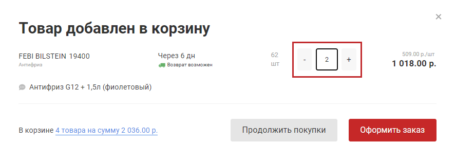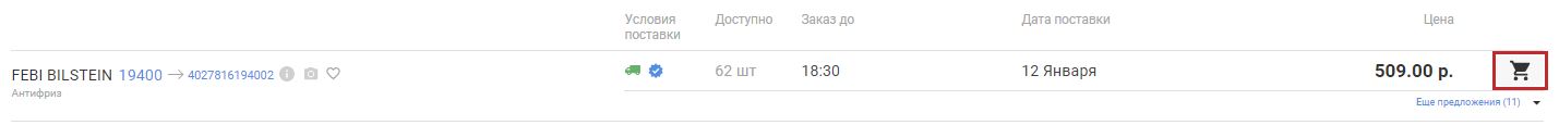 • Выберите подходящее предложение, нажмите на кнопку "Корзина" (рис. 1), укажите количество товара, добавьте деталь в Корзину. (рис. 2)