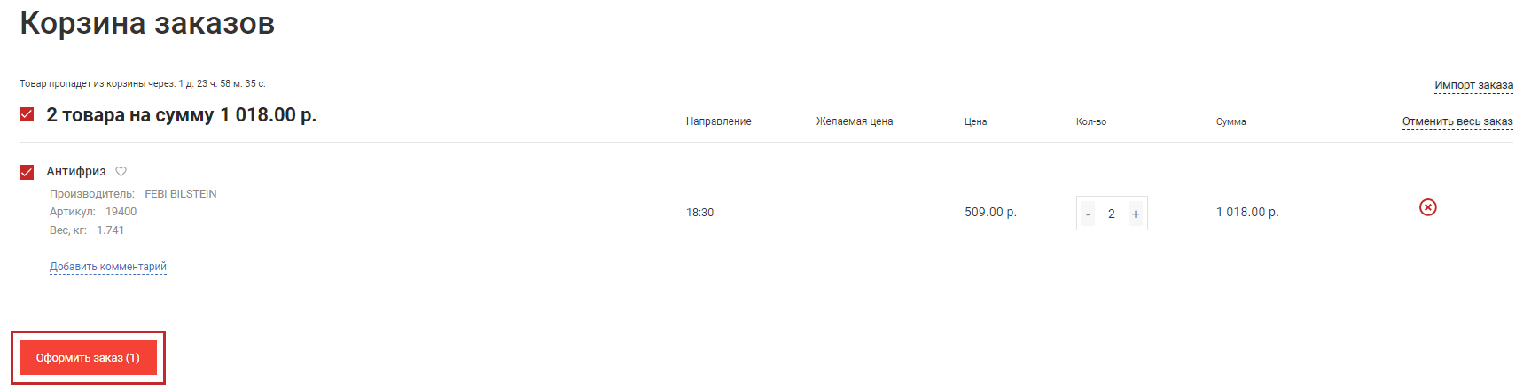 • Когда все необходимые детали будут в Корзине (рис. 3), переходите к оформлению заказа – для этого (рис. 4) установите флажки напротив нужных позиций в Корзине и нажмите кнопку «Оформить заказ».