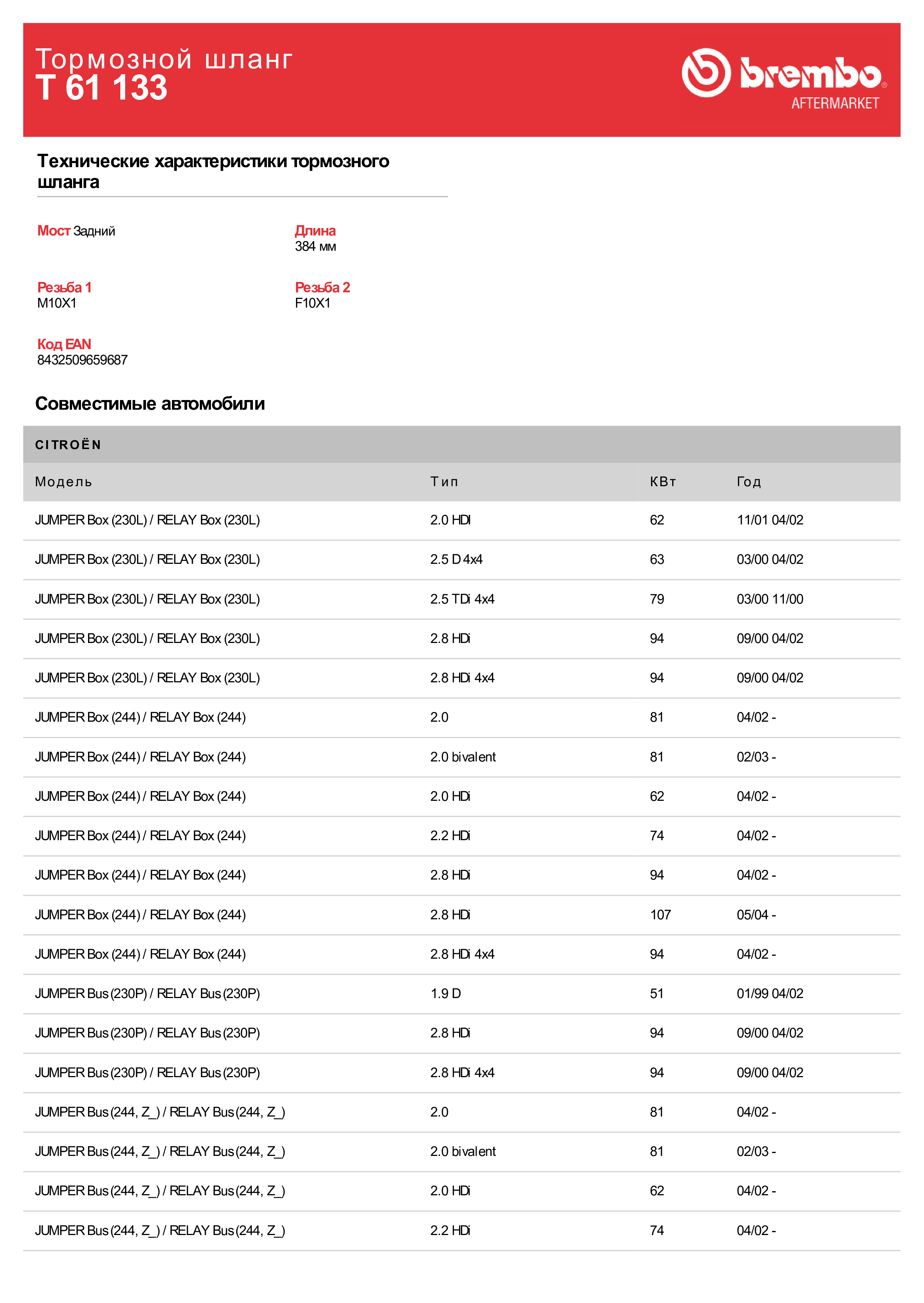 T61133 BREMBO Шланг тормозной