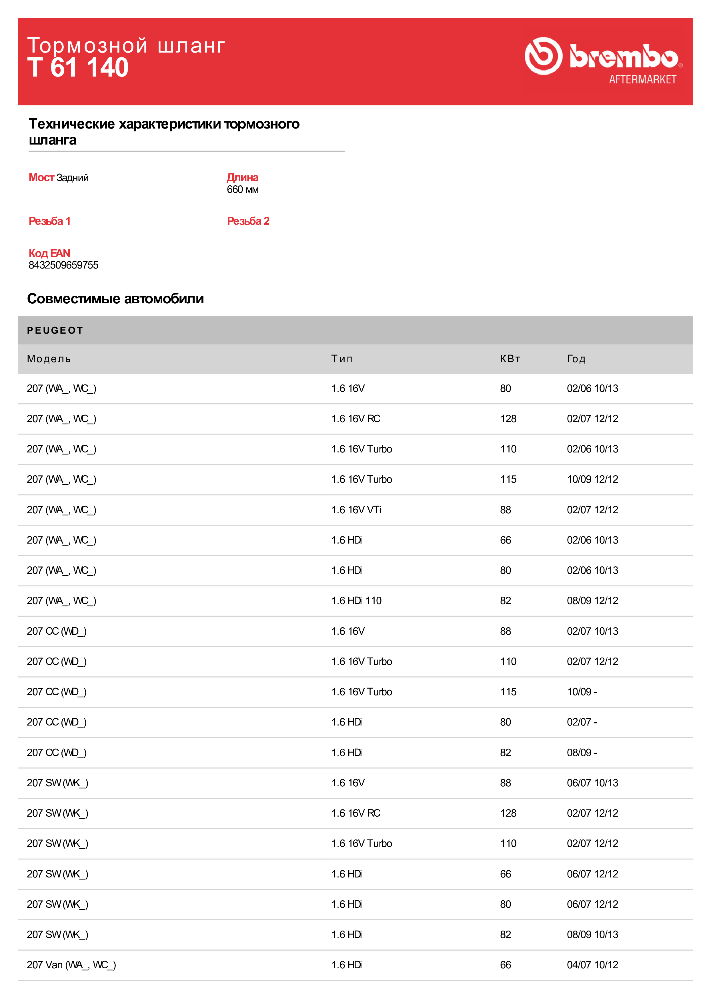 T61140 BREMBO Шланг тормозной