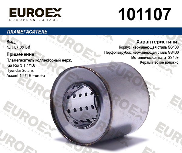 101107 EUROEX Пламегаситель коллекторный нерж. Kia Rio 3 1.4/1.6 , Hyundai Solaris/Accent 1.4/